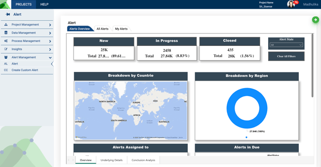 To access further details of a specific alert, click on an individual hyperlinked "Alert Id". You will be taken to a new tab where the work area will display all the features of the selected alert. This feature may also be accessed under My Alerts, i.e., for all alerts created or assigned to you.