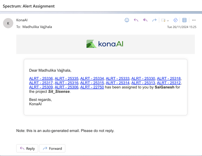 Once an alert is assigned, an email is sent to the person assigned notifying them of the alert assignment. The email provides a link to access the alert details.