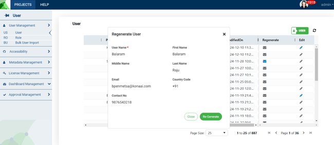 - The admin is notified on the konaAI application of a regeneration request on the “User” page.