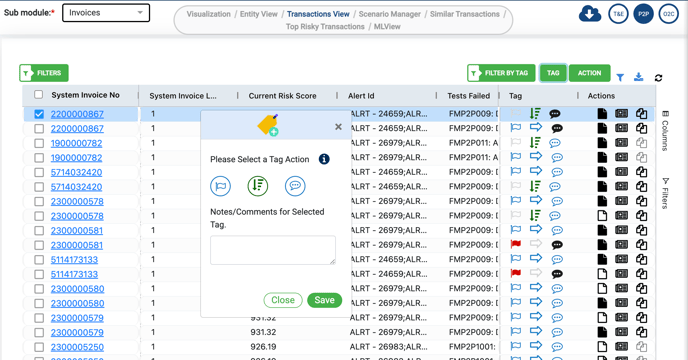 - Select all transactions of interest and select the “TAG” button on top. Then choose the Tag Action you desire (Flag, Downgrade, or Comments Only).
